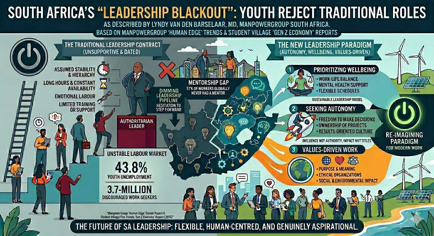 And then I read an article in the Sunday Times by Lyndy van den Barselaar, MD of Manpower South Africa, that gave a name to what I’ve been witnessing: a “leadership blackout.” Not a shortage of capable people. A shortage of desire. And I thought: yes. That’s exactly it.